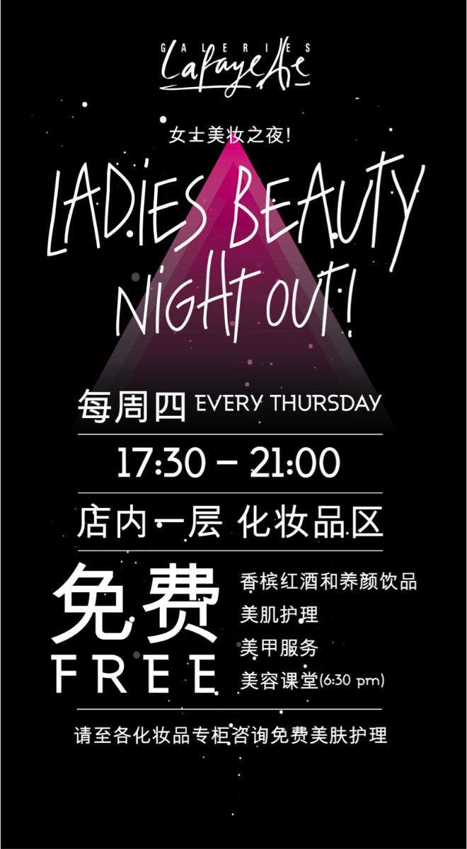 4月17日起,每周四17:30起老佛爷百货将在店内一层化妆品区为爱美爱时尚的女士们举办女士美妆之夜!(活动详情见下方)