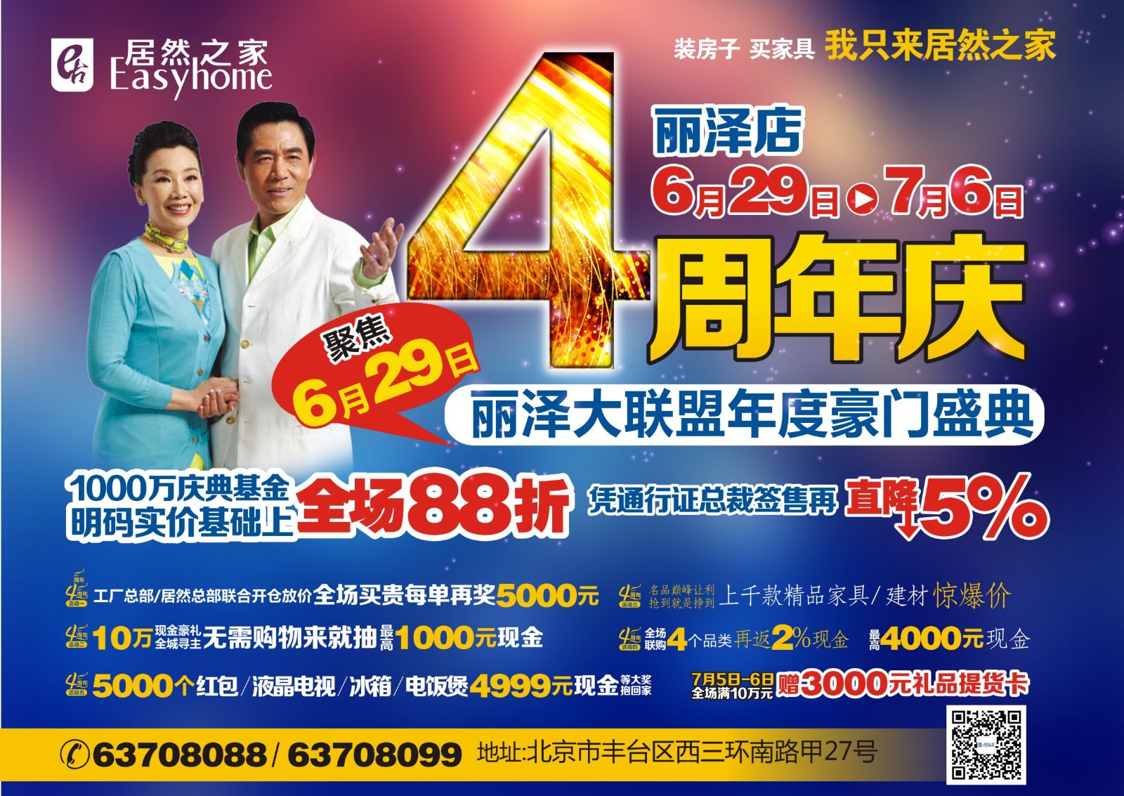 经过了4年的培育,居然之家丽泽店已经成为北京南城首屈一指高端家居卖场,同时也深得百姓的口碑相传。日前,居然之家丽泽店隆重宣布6月29日-7月6日将推出“4周年店庆—豪门盛典”活动,全方位,大手笔,强势引爆夏季家具建材促销高潮。